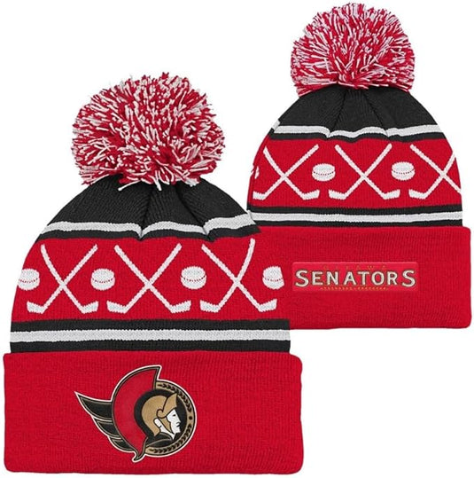 The Jacquard Cuff Knit Pom Pom Toque is a Kid's size 4-7 cuffed knit toque featuring team logo embroidery on front cuff. Made from 100% Acrylic. One size fits most.